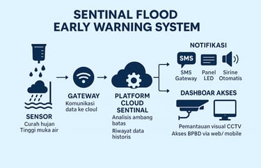 Monitoring & Detection – pengumpulan data real-time dari sensor curah hujan, aliran sungai, kelembapan tanah, dan level air.
